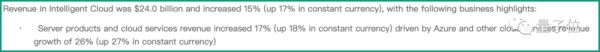 虽然说微软2023财年第四财季智能云部门的营收为239.93亿美元,相比上年同比增幅达到15%,但相比2022财年第四财季20%的增幅,增速变动并不大,反而还略有所下降。