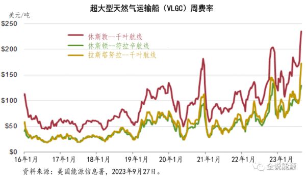 石化行业对丙烷作为原料的需求,也影响了超大型天然气运输船的费率。东亚地区对美国丙烷需求的增加,也造成了巴拿马运河的延误,因为这条航线上此类船舶需求的增加,造成了更大的阻塞。在截至2023年9月22日的一周内,使用巴拿马运河的美国休斯顿—日本千叶航线的超大型天然气运输船的费率,达到每吨235美元,这至少是自2016年首次公布费率以来的最高水平。