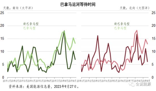 首先,由于巴拿马运河管理局采取的限行措施,导致了运河严重的拥堵,从而使得经由巴拿马运河船舶的平均等待时间,从不到一周增加到近一周半。而进入2023年8月,新巴拿马型船闸南行船舶的等待时间长达18天,北行船舶的等待时间长达17天;巴拿马型船闸,南行和北行船舶的等待时间长达18天。8月中旬,等待时间更增加到约为21天。