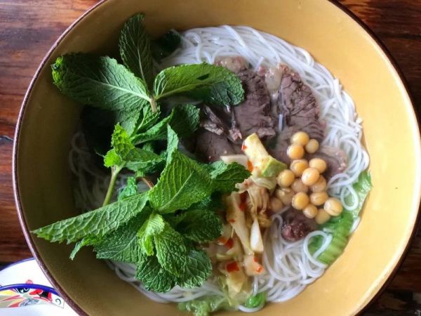 △当地特色的牛肉米线,配上薄荷叶醇香又清爽,好吃实惠,碗有脸盆那么大。(图/张小电)