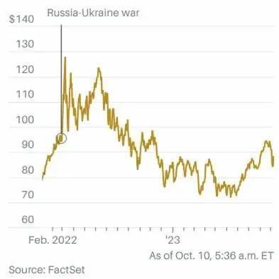 上周末布伦特原油价格的上涨幅度小于去年2月俄乌冲突爆发后的上涨幅度