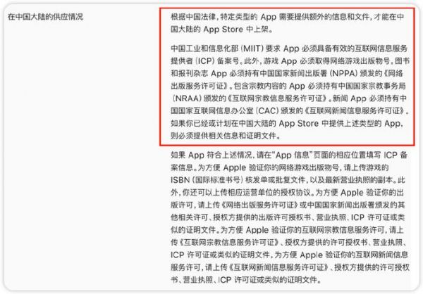 “根据中国法律,特定类型的App需要提供额外的信息和文件,才能在中国大陆的App Store上架。”也就是说,根据7月份工信部颁布的管理要求,App Store上的App必须备案。