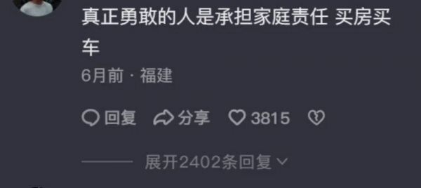 一条高赞评论是反驳这句话,觉得一冲动出门旅游不算勇敢,承担家庭责任、买房买车才算。
