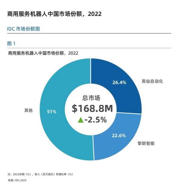今年7月,IT市场研究和咨询公司IDC发布的《商用服务机器人中国市场份额,2022》报告显示,擎朗智能和高仙自动化两家合计占据了约50%的商用服务机器人整体市场份额。
