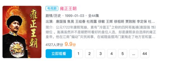 在这股热潮推动下,《雍正王朝》同《康熙王朝》在豆瓣的评分对比,也从一年多之前的8.8:9.2,迅速逆转为9.4:9.2。