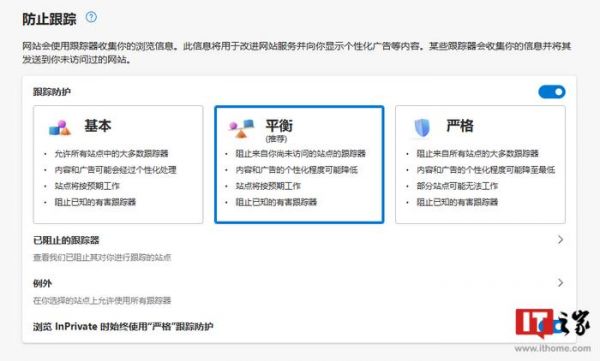针对这一问题,微软 Edge 等主流浏览器都提供了基本、平衡(默认)和严格三种跟踪保护模式,其中严格模式会阻止来自所有站点的大多数跟踪器,因此很多广告的个性化服务难以为继,这也导致部分站点可能无法正常访问。