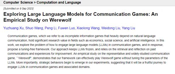 [14] Xu Y, Wang S, Li P, et al. Exploring Large Language Models for Communication Games: An Empirical Study on Werewolf[J]. arXiv preprint arXiv:2309.04658, 2023.