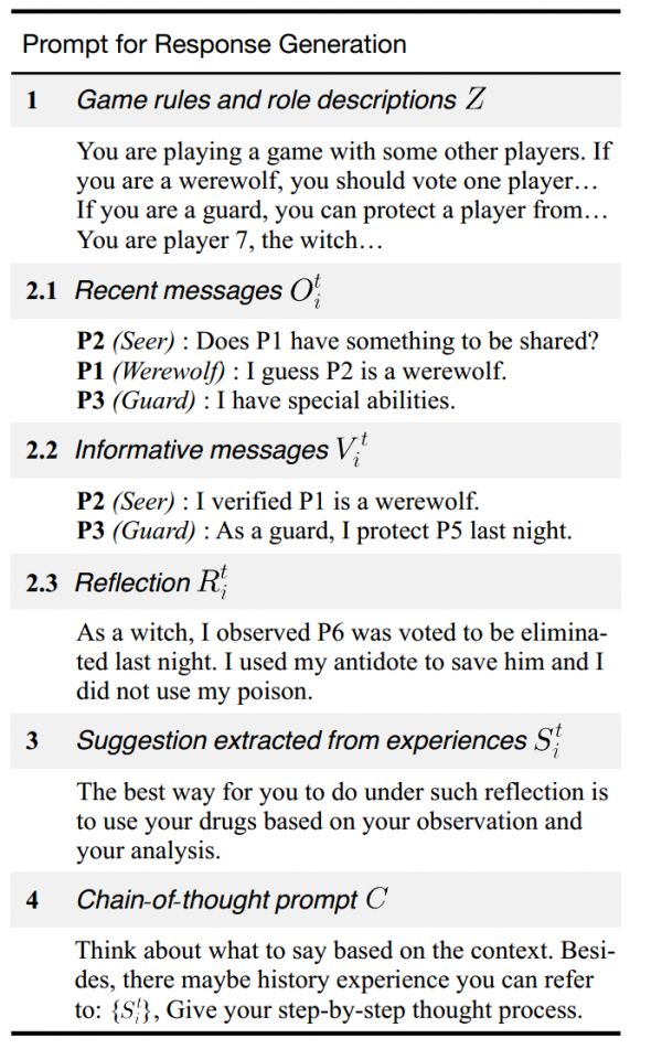 研究者通过提示框架使多个LLM成为玩家代理,参与到《狼人杀》游戏中。这一提示框架包含四个关键部分,分别为游戏规则、历史信息、游戏经验和思维链提示词。