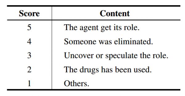 携带着关键信息、可以用于推断其他代理的角色的交流历史,通常被认为具有较高信息量,应当被包含在上下文中。为了提高效率,研究者按照图4中的规则对交流历史打分,并将排名最高的N条交流历史加入提示词中。