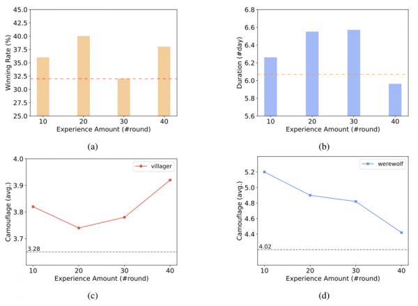 研究者在准备阶段构建了四种不同大小的经验池,分别包含了10轮、20轮、30轮和40轮的游戏经验。在验证阶段,他们将这些经验池提供给好人阵营(包括平民、女巫等角色)。研究者假设扮演狼人的LLM的性能水平保持不变,作为参考来衡量其他AI代理的性能水平。