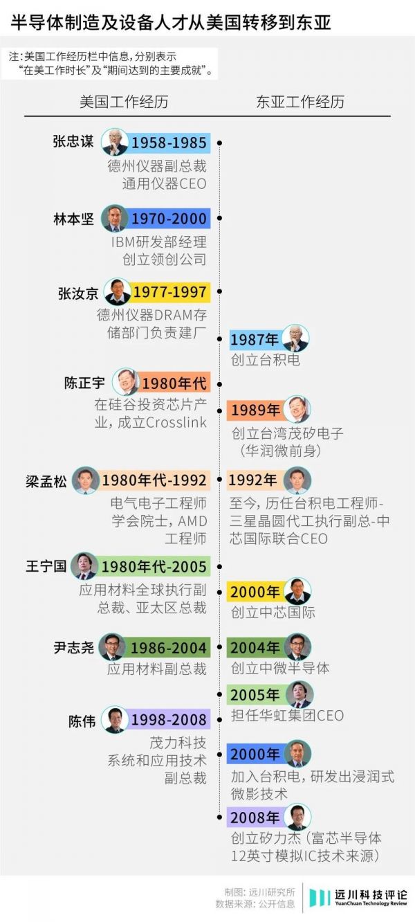 事实也是如此,美国芯片制造产业的建立来自许多亚洲面孔,他们大多都有赴美求学—在美国半导体公司工作—回亚洲创业的履历。在这个过程中,芯片制造的产线、研发和人才体系的中心也转移到了东亚地区。