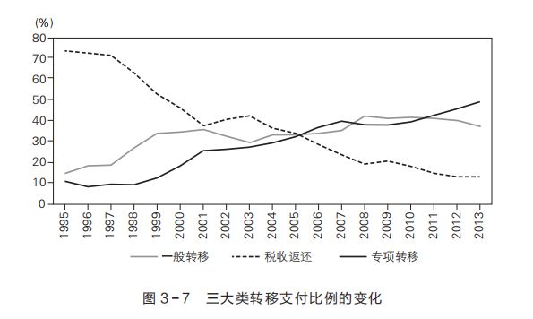 近年来,提高一般性转移支付比例的呼声越来越高。从图3—7也可以看出,自2011年开始,一般性转移支付超过了专项转移支付,但实际只是调整了各自的统计口径,还是有大量的转移支付是指定用途的。专项转移支付在现阶段有一定的合理性,特别是在约束地方行为和协调央地关系方面。