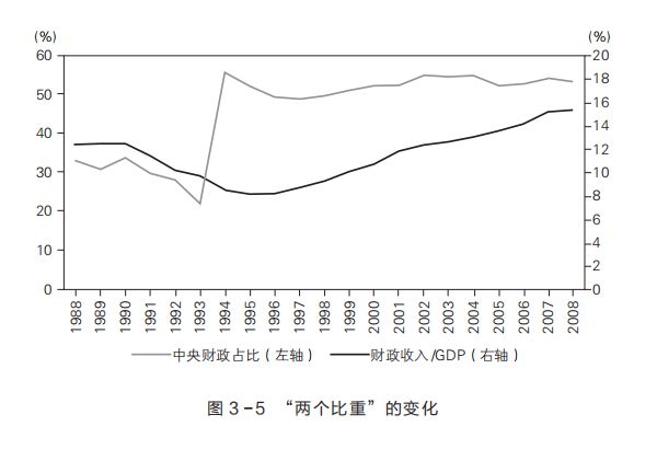这三个部分是彼此关联的,税制改革提高了税种的集中度,增值税成为第一大税种,跟中央财政收入相关的税基也扩大了。紧接着这些税种的管理权限全部纳入国税管理的范围,在操作层面保证了征管的独立性。最后将征收后的收入按照有利于中央财政的规则进行分成。分税制改革在提高“两个比重”方面的效果是立竿见影的。其中中央财政收入占全国财政收入的比重,由1993年的22%提高到1994年的56%,全国财政收入占GDP的比重也由最低的10%逐步提高至20%(见图3—5)。