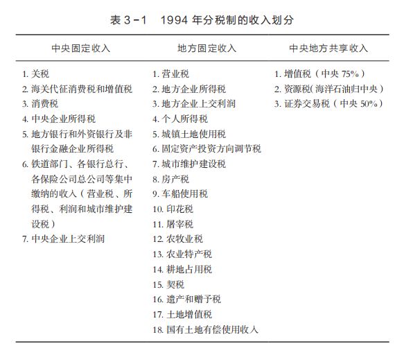 说了这么多,分税制到底做了什么呢?分税制改革的主要内容是三方面。首先是重新划分财政收支。相对来说,财政支出的变动并不明显,主要调整的是财政收入划分。如表3—1所示,中央固定收入包括三类,即消费税、进出口税、央企税收(不含增值税);地方固定收入中除了营业税和所得税之外,还包括土地相关的税收,特别是将土地出让金留给了地方财政;共享收入中的主体是增值税,中央分享75%。