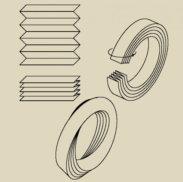 答案是,可以。只要把正方形手工纸,如下图折叠出形如手风琴的褶皱结构。把“纸风琴”整体当作是一条纸带,然后按正常莫比乌斯环的做法,把它扭转180度(半圈),再用胶水把插入彼此的两端粘在一起。它形成了一个“压缩”的莫比乌斯环,本质上和常见的莫比乌斯环完全相同,只不过我们无法在不破坏纸结构的情况下把它展成通常的莫比乌斯环罢了。所以,长宽比是1的纸带,在不要求光滑性时完全可以制作出莫比乌斯环。