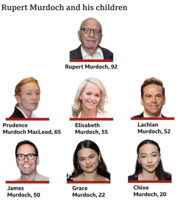 可是按照默克多家族信托文件所说,一旦默多克离世,他在新闻集团和福克斯集团的投票股权(有表决权的股份)将转给他四位最年长的子女:现年65岁的长女普鲁登斯、55岁的次女伊丽莎白、52岁的长子拉克兰以及50岁的次子詹姆斯。