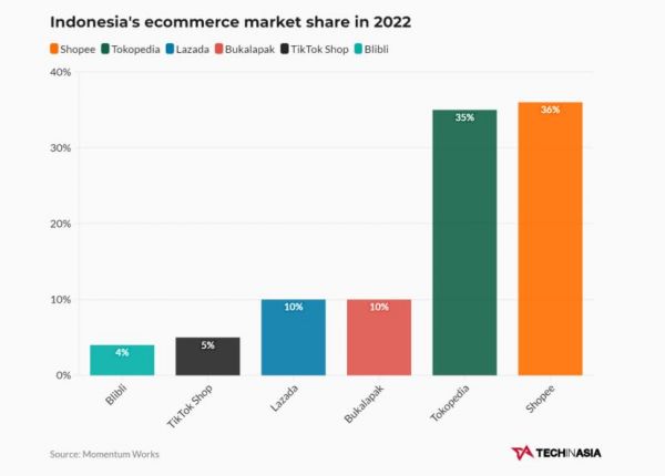 根据techinasia的数据,除TikTok Shop外,印尼市场电商平台主要有三家:Shopee、Tokopedia和Lazada。据TechinAsia报道,2022年,在印尼市场份额分别为36%、35%、10%。