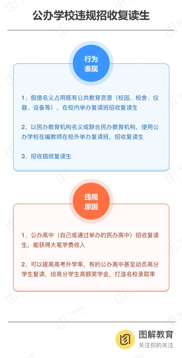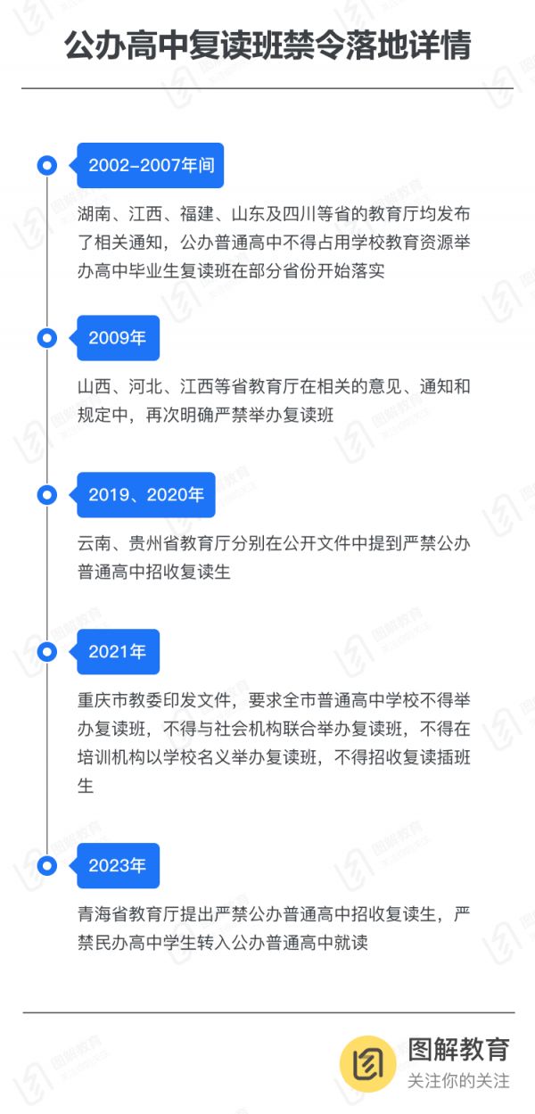 早在2002年,教育部《关于加强基础教育办学管理若干问题的通知》(教基〔2002〕1号)就明确规定,“各地公办高中不得占用学校正常的教育资源举办高中毕业生复读班,也不得招收高中毕业生插班复读”。