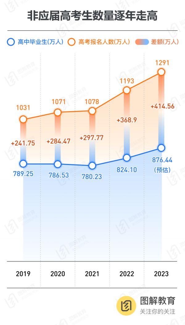 观察高考报名人数和高中毕业生人数,其间有一个差额,这就是高考复读生和社会报名高考的人士数量。这一差额在过去数年有明显增加,意味着非应届高考生数量逐年走高。