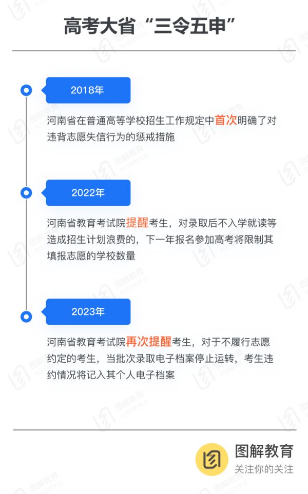 为了针对考生非“985、211”不上、录取后不报到的情况,好几年前河南就出台了政策,高校可以此拒绝录取失信考生,考生第二年高考志愿的选择也将受限制。
