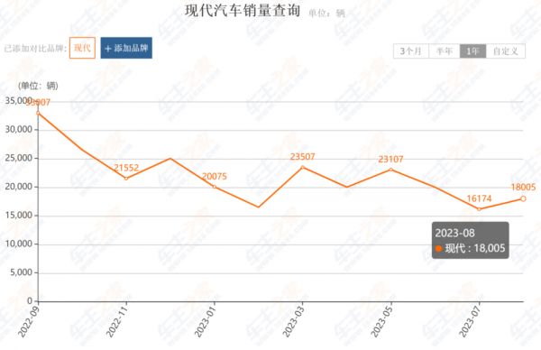 2023年上半年,北京现代销量12.3万辆。最新的2023年8月,北京现代销量为1.8万辆,当月中国市场销售市场份额掉到1%以下,在售汽车品牌销量排名已经从曾经最高的第二名,掉落至现在第二十二名。