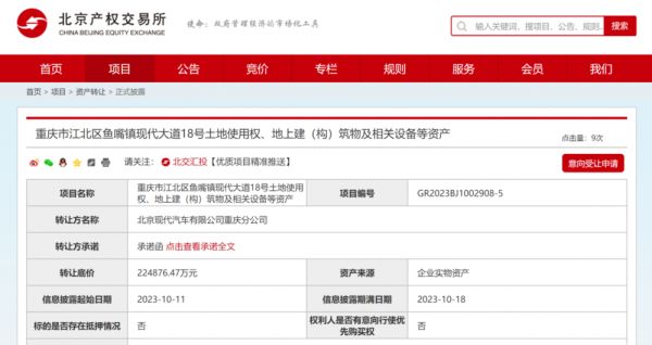 按照公告要求,北京现代重庆工厂意向受让方需要在2023年10月18日公告截止日前缴纳6.5亿元的保证金。