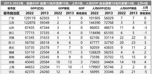 数据显示,2013年至2022年十年间,安徽排名上升三个位次,从十年前的第13位升至去年的全国第10,上升速度仅次于贵州。