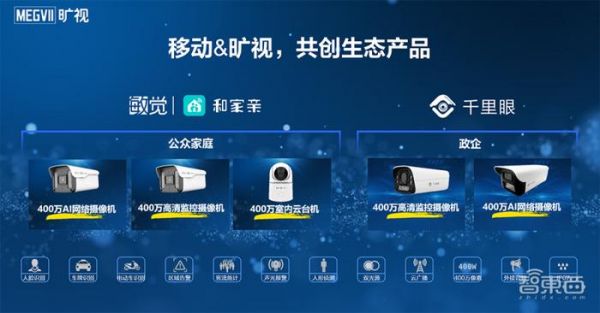 在“平安乡村”展区,可以看到旷视与移动联合推出的多款智能硬件设备,包括面向乡村家庭的“和家亲”系列产品,以及面向乡村行政管理单位和小微商户的千里眼系列摄像机。旷视还提供了自研的边缘计算单元“旷视魔方B4H”系列,能够辅助补充终端场景的算法和算力供给。