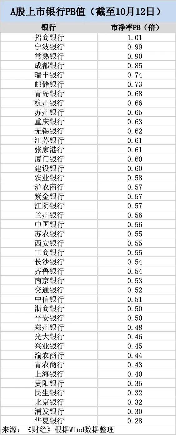 值得注意的是,银行一直处于低估值状态,今年以来银行股整体呈现波动态势。Wind数据显示,截至10月12日,A股42家上市银行中,除招商银行,41家银行均处于破净状态。