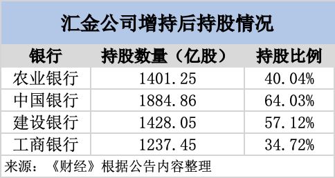 此次增持后,汇金持有农业银行、中国银行、建设银行、工商银行股份数分别达1401.25亿股、1884.86亿股、1428.05 亿股(A股2.14亿股,H股1425.90亿股)和1237.45亿股,持股比例分别升至40.04%、64.03%、57.12%和34.72%,均较增持前增加0.01个百分点。