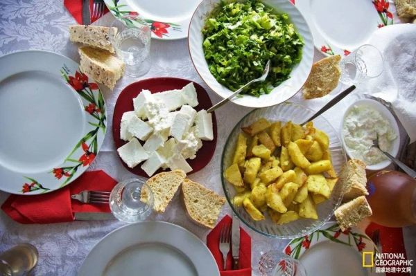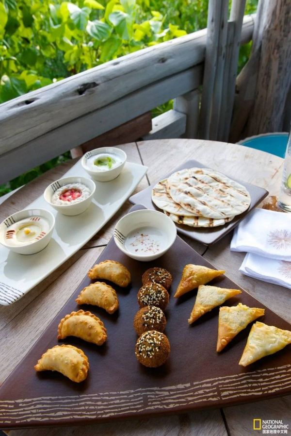 一桌典型的地中海菜肴包括以植物为原料的巴巴甘努什(baba ganoush,烤茄子泥),胡姆斯(hummus,鹰嘴豆泥),法拉费(falafel,炸豆丸子)和皮塔饼(pita),还有希腊酸奶黄瓜酱(tzatziki),这是一种加盐酸奶拌上黄瓜做成的酱汁,含有橄榄油、大蒜、柠檬汁、盐和香草。| JAD DAVENPORT, NAT GEO IMAGE COLLECTION