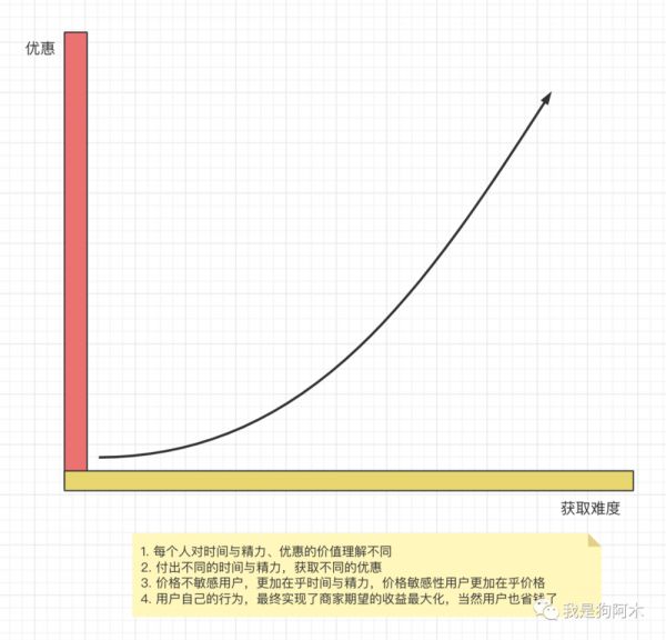 通过这样一个付出成本获取优惠的机制,实现了针对不同用户的动态优惠,完成了用户分层与针对每个用户的区别定价;最终不同消费能力的用户都认为省钱了,同时消费者剩余为0,商家+平台利润最大化状态。