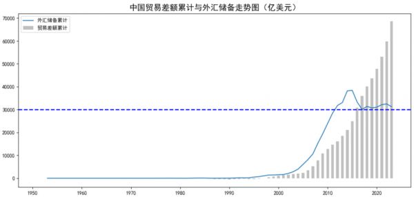 截至2022年底,中国累计贸易顺差为6.86万亿,这意味着中国企业和居民个人持有的外汇,已经超过央行储备,达到了将近4万亿美元,而美国从1976年以来的累计贸易逆差也不过15.5万亿美元。