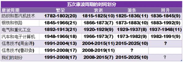 按照周金涛的思路,这一轮大的康波周期的起点是1991年,中间衰退和萧条期时间点跟我们的判断有所不同,但萧条期终点是一致的,同样都是指向2025年。