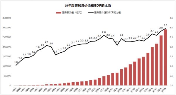 一般来说,一个国家房地产的总价值,相当于一个国家GDP的2-3倍,这是一条非常硬核的约束。1985年,中国这个比值只有1倍左右,随后逐年上升,大部分年份维持在2.3-2.5左右,从2015年开始这个比值有比较大幅度的提升,2019年这个比值接近3,但仍处于一个相对合理的范围内。