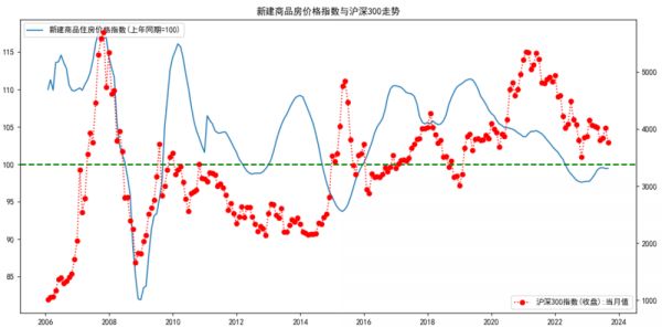 如果我们把新建商品房价格指数与沪深300走势做一张图,可以发现一个现象,那就是2006年开始的这波牛市,高点和低点刚好跟房价指数的高低位一一对应。而2013年以后,房价指数跟沪深300指数就可以逐渐背离,呈负相关的关系。