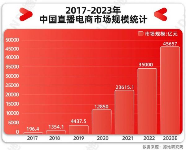 另据电数宝数据,2023年上半年,直播电商市场规模约为19916亿元,预计2023年全年,直播电商产业市场规模将达到45657亿元,同比增长30.44%。