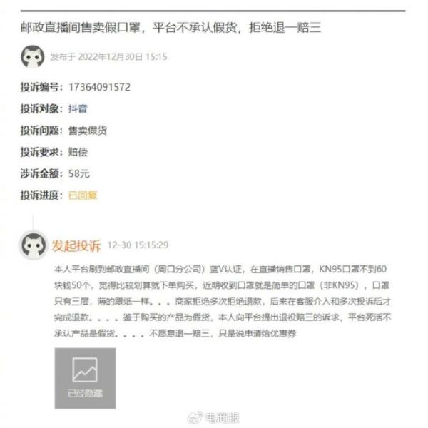 其次,快递企业的直播运营、选品、质检、主播资源等环节也是很薄弱。例如,虽然中国邮政成功出圈,但在带货时存在品控问题。去年12月,就有网友投诉,在邮政直播间购买的KN95口罩“货不对板”。