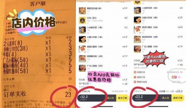 我特意对比了一下,那家炸串店,当天我在店里购买的商品实付价23元,如果通过外卖平台购买,应收价格在32.2元,如果叠加我到处搜罗的优惠券,优惠后价格是23.2元。虽然叠加优惠后价格差异不大,但每个人手中优惠券的情况是不同的。