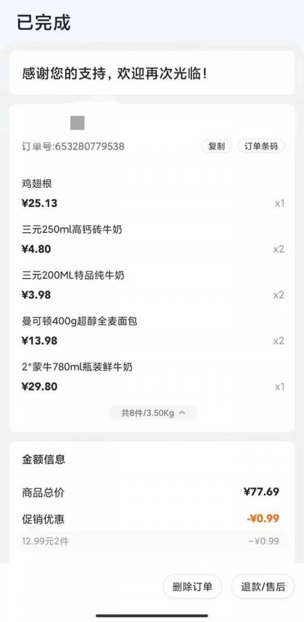后面,我又继续了此种“套路”。第二年会员卡到期,我选择了去线下续卡,并在享受线上红包优惠的同时,又被赠送了零食和牛奶,我也确认过都不是临期产品。