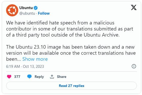 Canonical 在 X(推特)平台发布推文,表示由于 Ubuntu 23.10 中引入了来自第三方工具的众包用户翻译,结果发现了一些仇恨言论,目前已经撤回镜像,目前正重新调整编译 ISO 镜像。