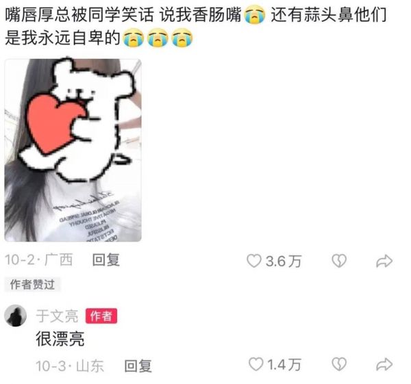 自称嘴唇厚、蒜头鼻的女生总是被同学笑话,在这里被于文亮和一众网友夸赞“很漂亮”。