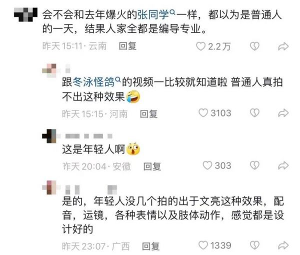 有网友将于文亮类比去年走红抖音的农村博主“张同学”,两人创作的内容都反映出普通人真实生活的那一面。不过“张同学”的视频看似简单,背后其实是专业摄影和剪辑。
