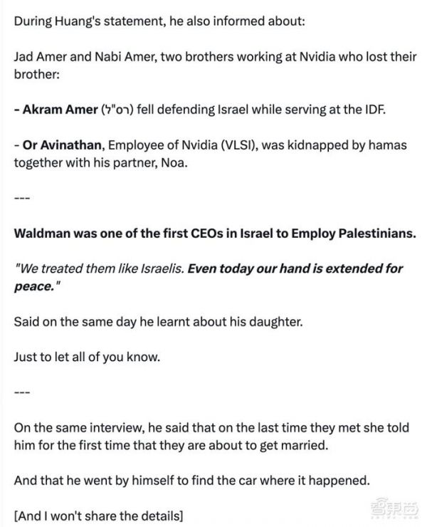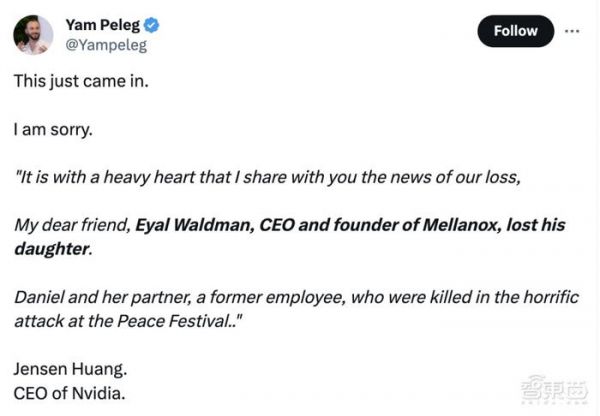 ▲黄仁勋内部信原文(图源:Yam Peleg在社交平台x发布内容)被英伟达收购的以色列网络芯片企业Mellanox的创始人兼CEO Eyal Waldman,他的女儿Danielle Waldman及其男友Noam Shai,在超新星音乐节(Supernova music festival)的恐怖袭击中丧生。而他女儿的男友曾是一名英伟达前雇员。