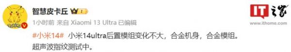 IT之家 10 月 12 日消息,据博主 @智慧皮卡丘 今日爆料,小米 14 Ultra 手机后置模组变化不大,采用合金机身 + 相机模组,正在测试超声波指纹。