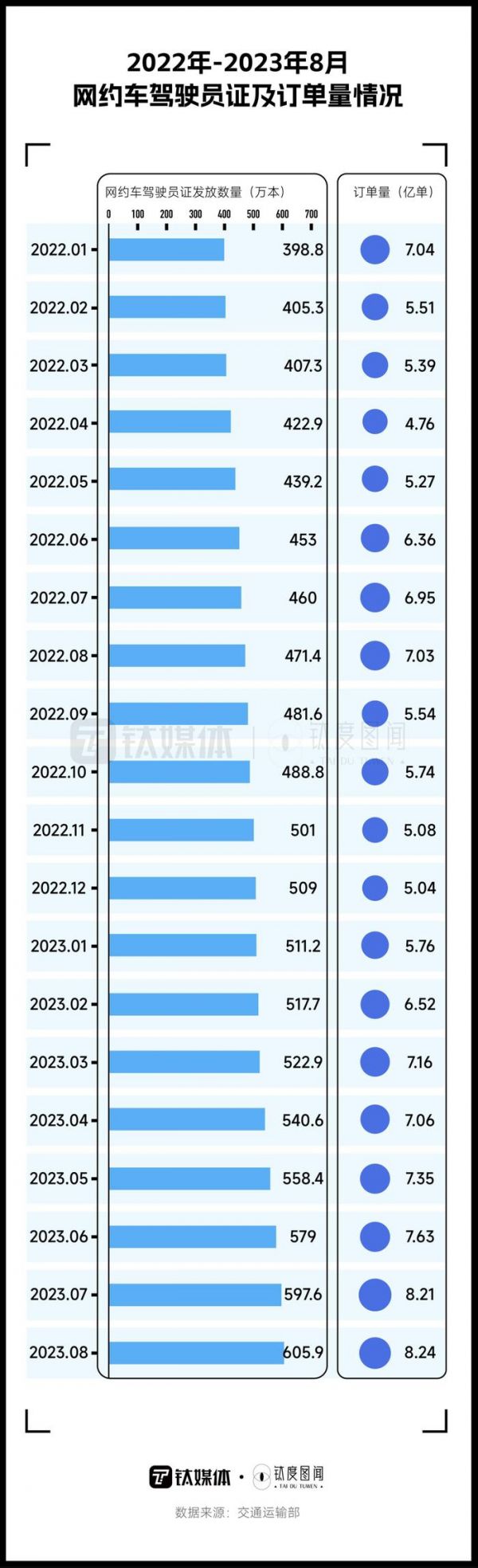 今年以来,随着居民出行加快恢复,其对网约车的需求也稳步上升。大量新司机持续涌入市场,让网约车市场变得越来越“卷”。2022年初,网约车驾驶员证发放数量为398.8万本,20个月后,这一数字已经上涨到605.9万本,涨幅为51.9%,也就是说,一年多的时间里,有207万个司机加入网约车行列。从2023年新发放的网约车驾驶员证数量来看,6月网约车驾驶员证数量增长最多,同比增加20.6万本,平均每天新增6867个网约车司机。对比2022年,去年5月新增加了16万本网约车驾驶员证,月新增数量为全年最多。由此可见,今年每个月新发放的网约车驾驶员证数量比去年增长不少。