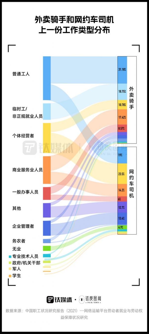 数据来源:魁阁学刊、中国就业发展报告(2022)、滴滴、中国职工状况研究报告(2021)、美团外卖骑手就业报告、美团社会责任报告、交通运输部等公开资料整理。