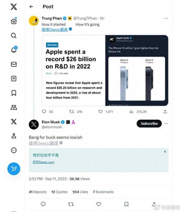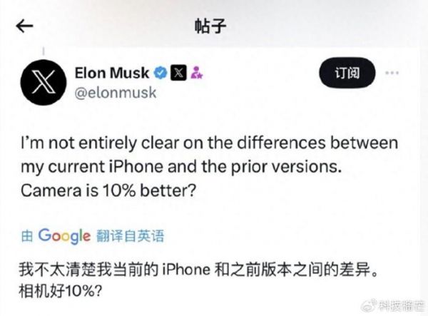 有意思的是,世界首富马斯克也非常认同这位大V的观点,他在这条推特下面吐槽说:“性价比似乎不高。”很明显,马斯克对于苹果这种高投入却只有微产出的研发很有看法。前两天,他还吐槽说,iPhone 15和前几代iPhone有什么区别吗?只是相机提升了10%?