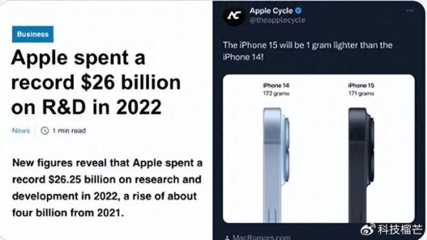 根据外国大V公布的数据,2022年苹果的研发262.5 亿美元(约 1932 亿元人民币),看起来似乎很多。不过这位大V还公布了一张对比图,图中显示iPhone 15仅比iPhone 14轻了一克,显然是在嘲讽苹果花了那么多的研发费用,结果就这?