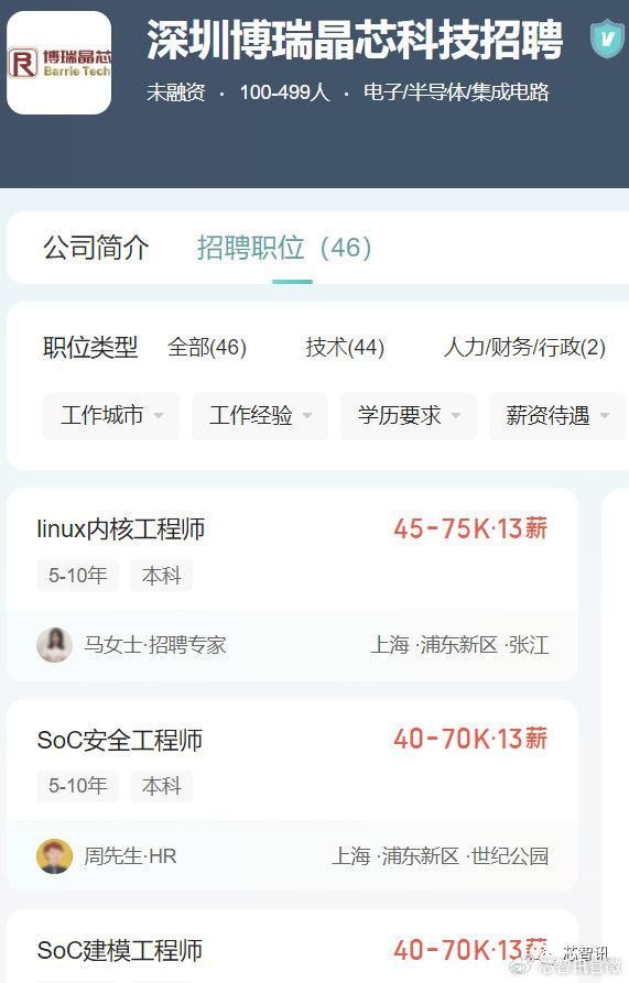 博瑞晶芯在今年2月获得融资之后,还开启了大规模的招聘。根据BOSS直聘上的信息来看,博瑞晶芯目前招聘的职位共有46个,其中技术类有44个。